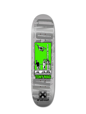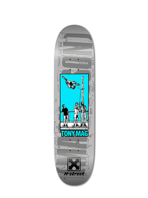 Tony Mag blasted 11 feet in his famous Cedar Crest Air, circa 1988. This street board graphic commemorates this epic event. A great all-around street deck made in the USA and constructed with high quality maple wood.