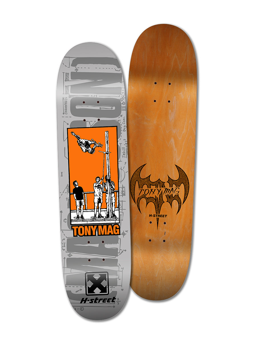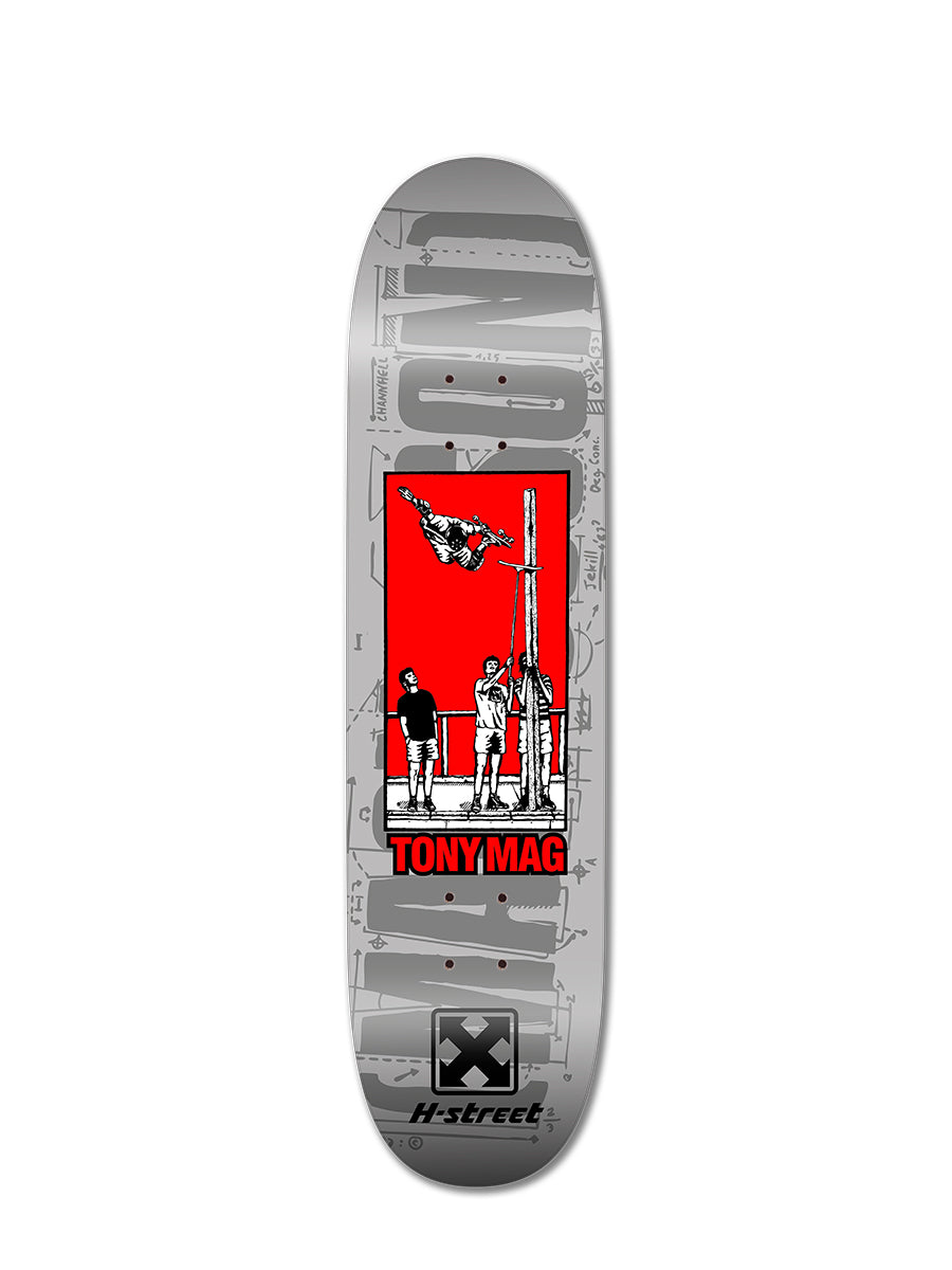 This graphic was drawn by H-Street OG artist Francesco Jekill Albertini back in the 80’s for a T-Shirt graphic. Years later, Mag turned this into a board graphic with the background also drawn by Francesco.