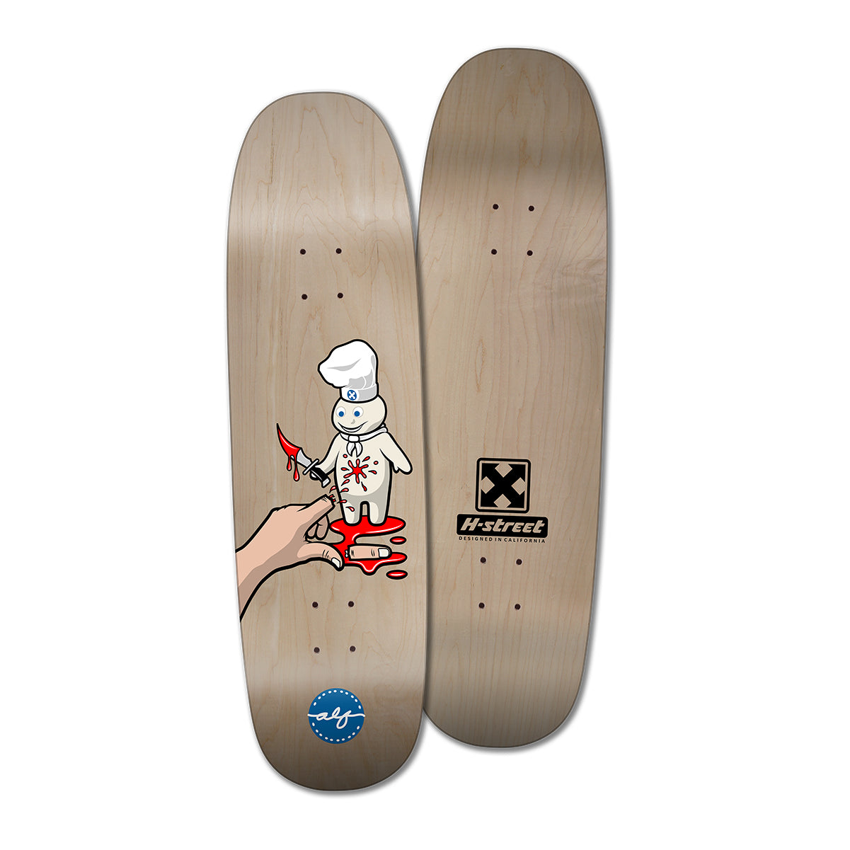 We are also so stoked to have made a connection with Ohio 90’s skater and artist Bob Hickman, who has made it his specialty to draw puppets and to come up with super cool guest versions of our classic artwork. As such, when he found out that we were finally getting around to re-issuing decks from the H-Street Next Generation of riders, he sent T-Mag a rather interesting and fun “Hickman Version” of Alf’s classic Dough Boy.