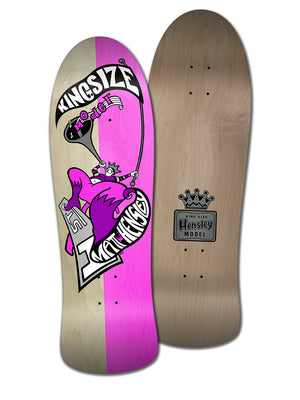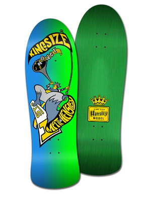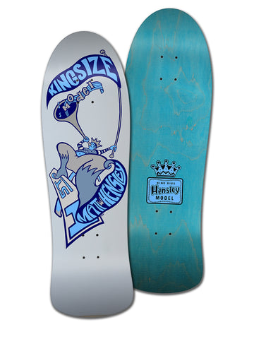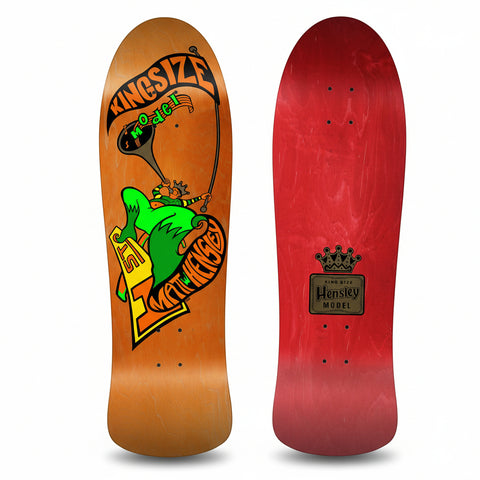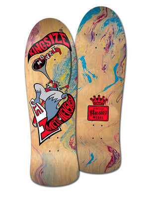 The Matt Hensley original Kingsize Hornblower was Matt’s second Pro Model on H-Street and it came out in around the same time as the mini board in the late 80’s. The Hornblower was also made on a different shape, much closer to the Street Swinger but with a bigger nose (thus shorter wheelbase) which we think came out before this shape. Because this shape is what Matt wanted to re-issue and he has as an original from back then, we opted for this more progressive shape.